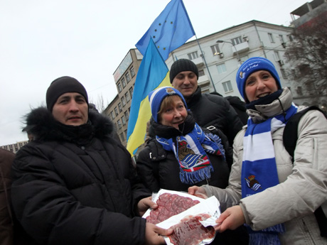 Болельщики принесли участникам митинга против сворачивания евроинтеграции запакованную колбасную нарезку.