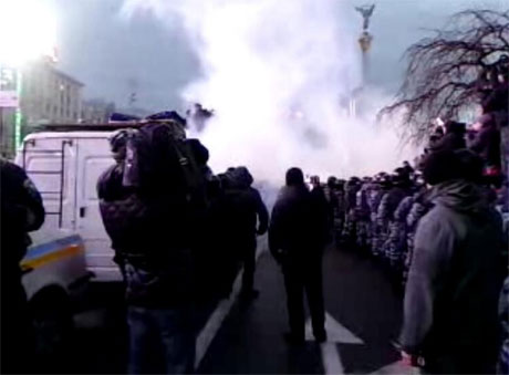 По данным корреспондента УП, "Беркут" сдерживает толпу, которая из-за большого количества митингующих постоянно пытается выйти на проезжую часть.