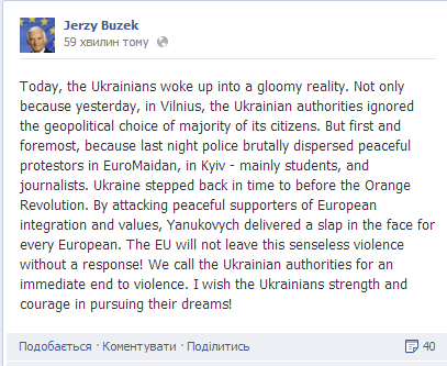 "ЕС не оставит это бессмысленное насилие без ответа ! Мы призываем украинскую власть к немедленному прекращению насилия. Желаю силы украинской и мужества в отстаивании своих желаний! " - Отметил он/