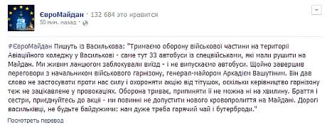 "Держим оборону воинской части на территории Авиационного колледжа в Василькове - именно здесь 33 автобуса с спецвойсками, которые должны были двинуться на Майдан. Мы живой цепью заблокировали выезд - и не выпускаем автобусы", - сообщил один из местных жителей.
