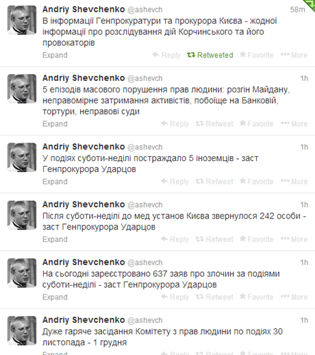 "5 эпизодов массового нарушения прав человека: разгон Майдана, неправомерное задержание активистов, побоище на Банковой, пытки, неправовые суды. В событиях субботы-воскресенья пострадали 5 иностранцев. После субботы- воскресенья до медицинских учреждений Киева обратилось 242 человека" , - привел слова Ударцова Шевченко.