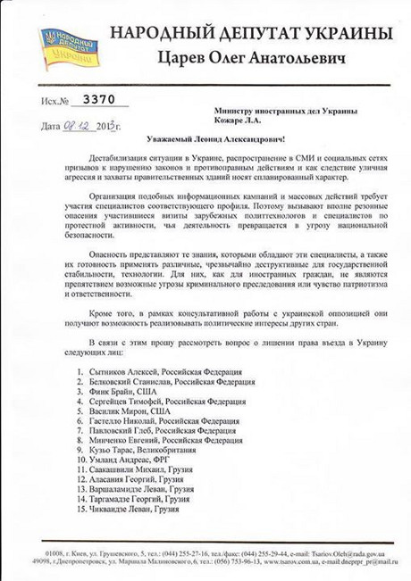 Нардеп от ПР Олег Царев просит МИД и СБУ рассмотреть вопрос о запрете въезда в Украну для ряда лиц, которые якобы могут способствовать разворачиванью антиправительственных демонстраций.