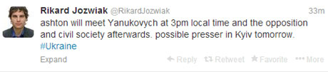"Эштон встретится с Януковичем в 3 часа по местному времени, с лидерами оппозиции и общественности", - написал он.