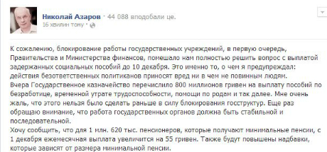 Об этом заявил премьер-министр Николай Азаров на своей страничке в Facebook.