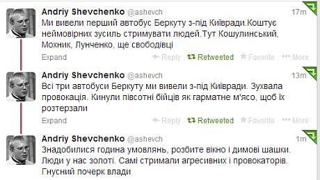 Депутат Andriy Shevchenko написал в Твиттере около 10:15: "Мы вывели первый автобус Беркута из-под Киевсовета. Стоит невероятных усилий сдерживать людей. Здесь Кошулинский, Мохник, Лунченко, еще свободовцы"