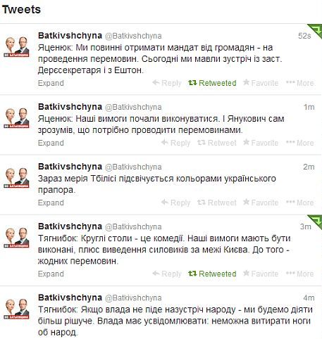 "Требования оппозиции и Майдана неизменны: отставка правительства, наказание всех виновных в избиении мирных протестующих с привлечением их к криминальной ответственности и полная перезагрузка власти. Никаких решений относительно наших дальнейших действий, да еще и якобы относительно переговоров с властью, мы не принимали – все это ложь и дезинформация", - сказал он.