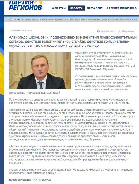 Сначала на сайте висел комментарий Ефремова службе ВВС, в котором он осудил действия правоохранителей во время попытки штурма евромайдана в ночь со вторника на среду.