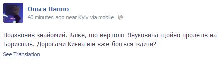 "Позвонил знакомый. Говорит, что вертолет Януковича только что пролетел на Борисполь. По дорогам Киева он уже боится ездить?", - написала пресс-секретарь "Фронта змин" Ольга Лаппо в Facebook около 11 часов.