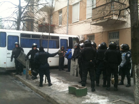 Врзле некоторых из них выстроились несколько отрядов внутренних войск в полном обмундировании в шлемах и со щитами.