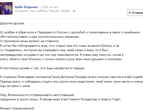 Об этом он заявил в первом после освобождения из колонии заявлении, которое опубликовала пресс-секретарь Ходорковского Кулле Писпанен в своем Facebook.