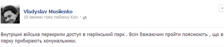 В то же время, по состоянию на 15:40 внутренние войска полностью перекрыли доступ в Мариинский парк, сообщил фотограф Влад Мусиенко.