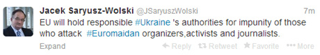 "ЕС будет считать украинское руководство ответственным за безнаказанность нападавших на организаторов, активистов и журналистов Евромайдана", - написал он.