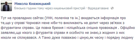 "Здесь на провластных сайтах (УНН, полемика и др.) вбрасывается информация о том, что в деле Чорновол меня якобы вызывают на допрос из-за связи с фигурантами дела. Это полное вранье и милицейская смешная провокация", - написал он.