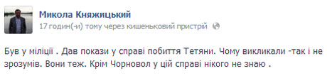 "Был в милиции. Дал показания по делу избиения Татьяны. Почему вызвали - так и не понял. Они тоже. Кроме Черновол в этом деле никого не знаю", - написал он.