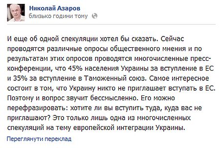 "Сейчас проводятся различные опросы общественного мнения и по результатам этих опросов проводятся многочисленные пресс-конференции, что 45% населения Украины за вступление в ЕС и 35% за вступление в Таможенный союз", - сказал Азаров.