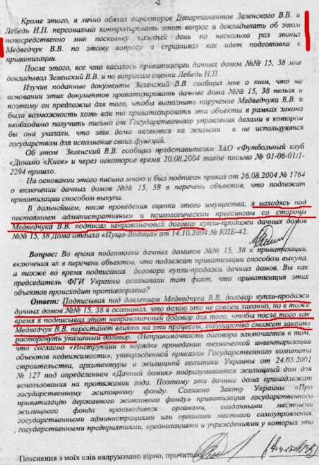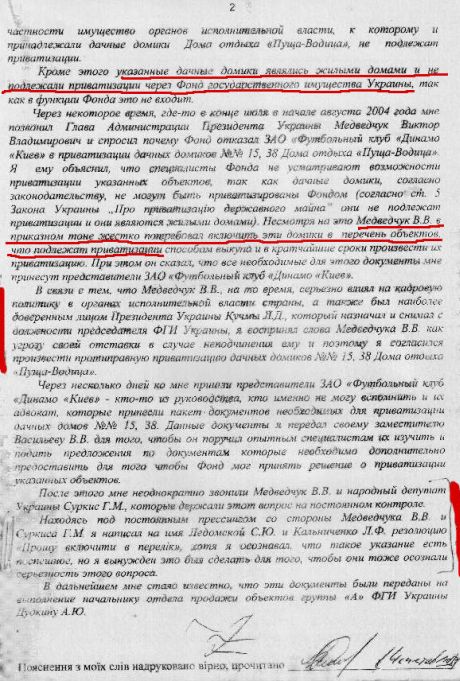 В протоколе явки с повинной за 25 августа 2005 года и объяснении к нему тогдашний глава Фонда госимущества Чечетов сообщил, что под давлением тогдашнего главы Администрации президента Медведчука разрешил незаконную приватизацию домиков в Пуще-Водицы в пользу ЗАО "Футбольный клуб Динамо-Киев".