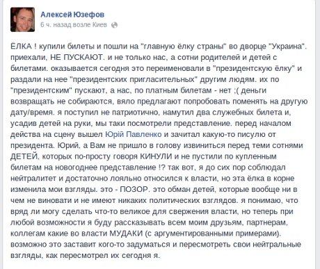 "Купили билеты и пошли на "главную ёлку страны" во дворце "Украина". Приехали - не пускают, и не только нас, а сотни родителей и детей с билетами. - рассказал в своем посту Алексей Юзефов.