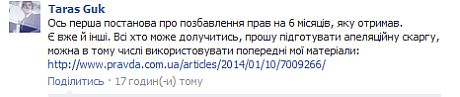 Соответствующее постановление судьи Владислава Лысенко обнародовал на своей Facebook-странице Тарас Гук.