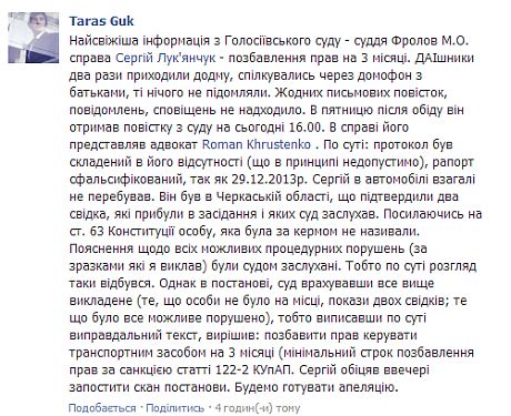 "Однако в постановлении, суд учитывая все вышеизложенное (то, что лица не было на месте, показания двух свидетелей; то что было все возможное нарушено), т.е. выписав по сути оправдательный текст, решил: лишить права управлять транспортным средством на 3 месяца (минимальный срок лишения прав за санкцией статьи 122-2 КУоАП). Будем готовить апелляцию", - отметил Гук.