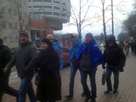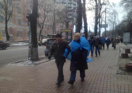 Чуть дальше, от парка и площади Славы шли две колоны: одна с табличкой "Партия регионов. Ривненщина" - там лишь кое-кто был завернут во флаги Партии регионов, а вторая – с поднятыми флагами Партии регионов.