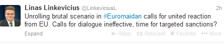 "Развертывание жестокого сценария на Евромайдане требует единой реакции ЕС. Призывы к диалогу - неэффективны. А следовательно настало время для адресных санкций", - написал он.