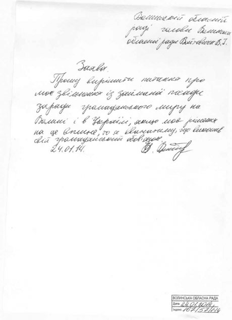 Председатель ОГА Борис Климчук также написал заявление об отставке. Как сообщает Волынские новости, по его словам, он это сделал для сохранения мира и спокойствия в Украине, попросив у лидеров луцкого Евромайдана написать заявления о том, что они не будут призывать граждан к насилию .
