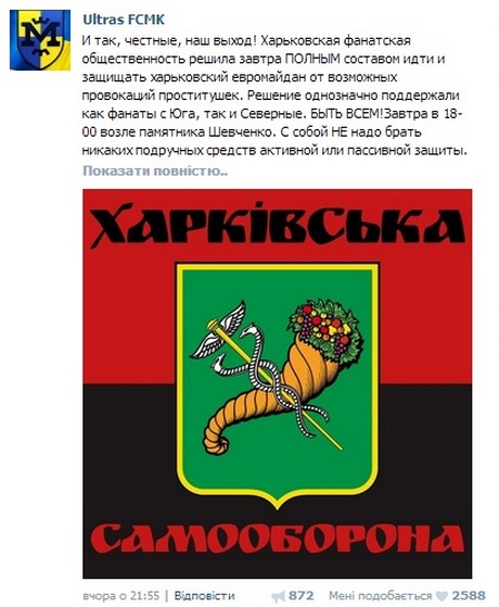 "Итак, честные, наш выход! Харьковская фанатская общественность решила полным составом идти и защищать харьковский Евромайдан от возможных провокаций "проститушек", - говорится в тексте.