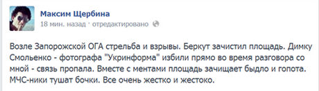 Так, местный журналист Тарас Билка сообщил на своей странице в Facebook: "Баррикада растет. Запорожье скандирует "Запорожская Сечь" ... Со второго этажа ОГА (где были неизвестные в масках, возможно - титушки) исчезли нелюди. Милиция выстраивается. Со стороны профсоюзов прибыло 30 космонавтов (ВВ или Беркут в шлемах). В рядах ментов видим молодых в штатском. Бритых".