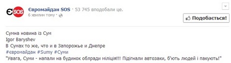 "Милиция жестко, без всякого предупреждения зачистила Сумской дом советов. Били дубинками, паковали людей, по словам очевидцев, гнали людей по площади... Сколько людей арестованы пока неизвестно, представители милиции вообще не отвечают на вопросы, не показывают документы, не говорят, кто старший" , - пишет активист Евгений Положий.