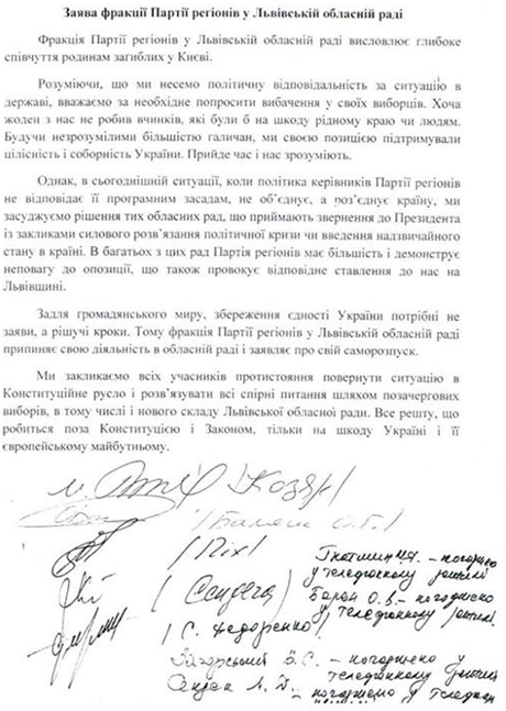 Как известно, Львовская областная организация Партии регионов ранее выступила за отставку премьер-министра Николая Азарова, правительства и проведения перевыборов в Верховную Раду и президента.