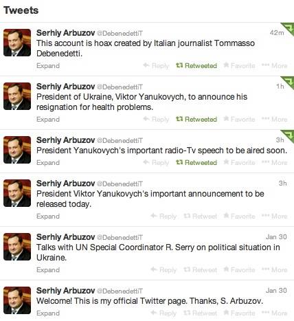 Как известно, в понедельник фейковый аккаунт уже успел сообщить, что Виктор Янукович готовит объявления о своей отставке.