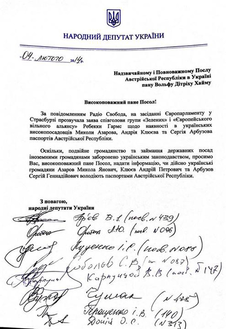 Ряд депутатов Верховной Рады обратились к послу Австрии Вольфу Дитриху Хайму с просьбой предоставить информацию, обладают ли Сергей Арбузов, Николай Азаров и Андрей Клюев австрийским паспортам.