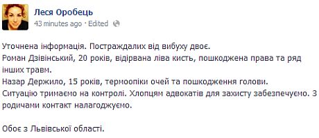 В то же время, депутат Леся Оробец сообщает, что одному из пострадавших – 15 лет. Оба они - из Львовской области