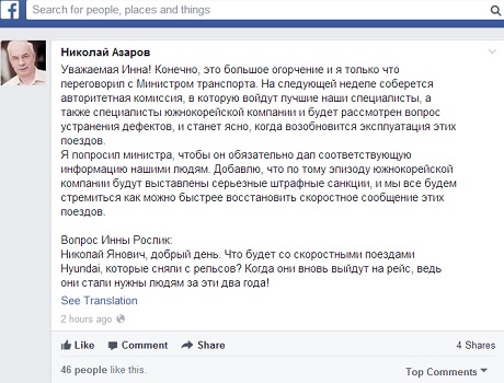 "Это большое огорчение, и я только что переговорил с министром транспорта. На следующей неделе соберется авторитетная комиссия, в которую войдут лучшие наши специалисты, а также специалисты южнокорейской компании", - написал Азаров.