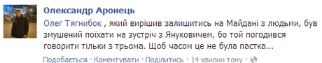 По состоянию на 0:41 19 февраля свободовец Александр Аронец написал, что лидер партии Олег Тягнибок, который решил остаться на Майдане с людьми, "был вынужден отправиться на встречу с Януковичем, ибо согласился говорить только с тремя".
