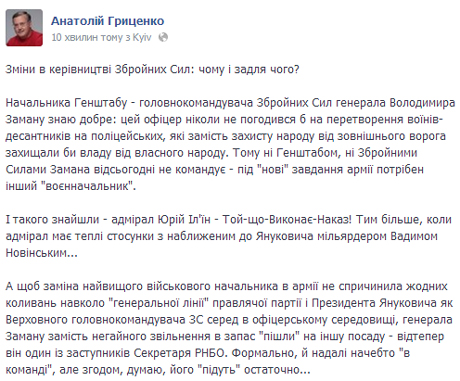 "Поэтому ни Генштабом, ни Вооруженными Силами Замана отныне не командует – под "новые" задачи армии нужен другой "военачальник" . И такого нашли - адмирал Юрий Ильин - Тот что-Выполнит-Приказ!" , - отметил Гриценко.