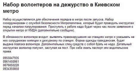 Кроме того, группа Евромайдан SOS распространила объявление о наборе волонтеров для дежурства на станциях метро для охраны общественного порядка. Детали - по ссылке.