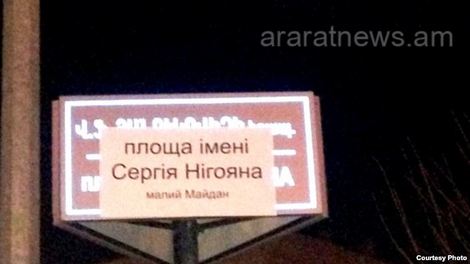 Группа активистов армянского происхождения переименовали площадь в городе Спитак, названную в честь украинского президента Виктора Януковича, в площадь имени застреленного во время противостояний в Киеве активиста Сергея Нигояна.
