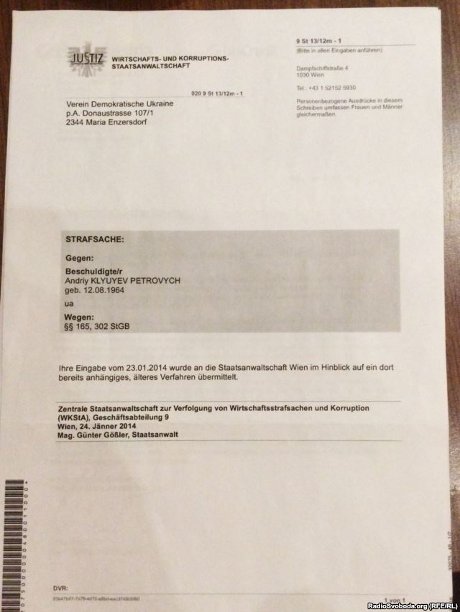 Ваше представление от 23.01.2014 было перенаправлено в прокуратуру Вены учитывая уже начатое там производство"