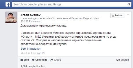 "В отношениии Евгения Жилина, лидера харьковской организации "Оплот" - МВД Украины возбудило уголовное преследование по ряду статей УК", - написал Аваков.