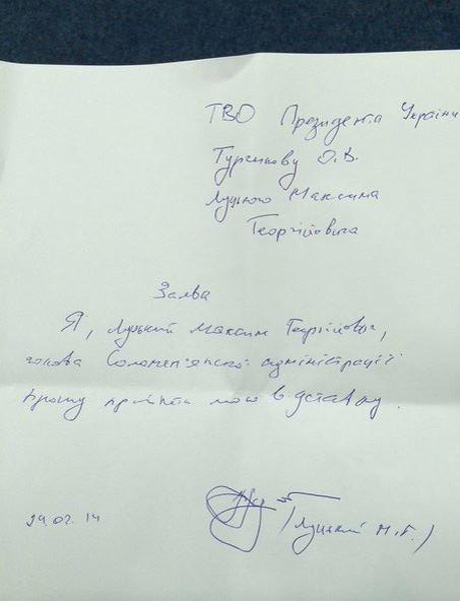 "Я, Луцкий Максим Георгиевич, председатель Соломенской администрации, прошу принять мою отставку", - говорится в документе.