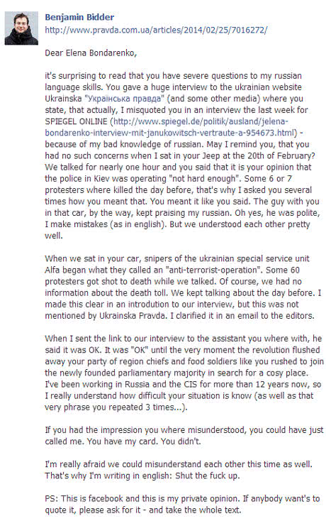 Журналист издания Spiegel Online Бенджамин Биддер, который брал скандальное интервью у регионалки Елены Бондаренко, заявляет, что ее помощник не имел предостережений относительно текста опубликованного интервью.