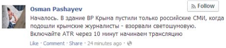 Журналист Осман Пашаев же сообщаил в Фейбсуке: "В здание ВР Крыма пустили только российские СМИ, когда подошли крымские журналисты - взорвали светошумовую (гранату)".
