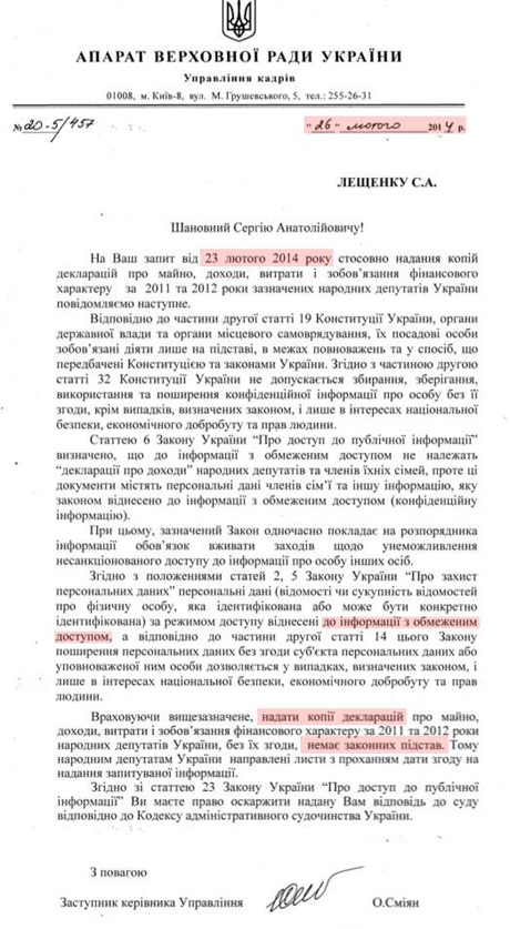 26 февраля Лещенко получил отказ, подписанное заместителем руководителя Управления аппаратом Верховной Рады, с аргументацией - "предоставить соответствующие декларации нет законных оснований".