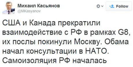 "США и Канада прекратили взаимодействие с РФ в рамках G8, их послы покинули Москву. Обама начал консультации в НАТО. Самоизоляция РФ началась", - заявил он.
