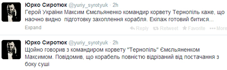 Немного спустя он написал: "Герой Украины Максим Емельяненко командир корвета "Тернополь" говорит, что наглядно видна подготовка захвата корабля. Экипаж готов биться".