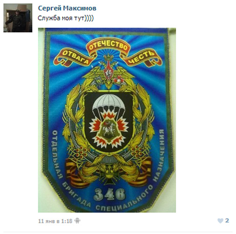 Скриншот страницы, подписанной "Сергей Максимов" в Facebook разместил активист Виталий Уманец. На нем есть фото парня одетого в камуфляжную форму без опознавательных знаков и носит маску, по своим видом напоминая так называемую "самооборону", которя действует в Крыму, блокируя украинские воинские части и корабли. В строке статуса указано "на Украине". Сейчас аккаунт уже недоступен.