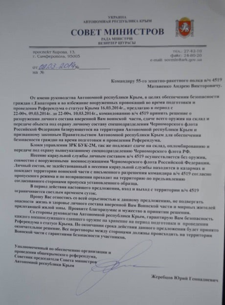 Согласно тексту документа, "в целях обеспечения безопасности граждан Евпатории и во избежание провокаций во время подготовки проведения референдума 16 марта", предлагается в период с 22:00 9 марта до 22:00 10 марта командованию воинской части А4519 принять решение о разоружении личного состава воинской части, сдачи всего оружия на склад и передачи объекта под охрану личному составу спецподразделению ЧФ РФ".