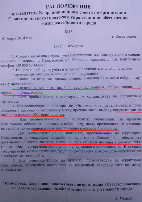 По его словам, во вторник в часть пришел глава союза ветеранов-химиков господин Папура, который принес распоряжение от главы координационного совета Севастопольского горуправления Чалого.