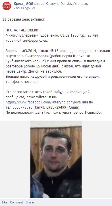 Связь из 28-летним Вдовченко пропала 11 марта после 15:00, когда он двигался из центра Симферополя домой, сообщает сообщество "Крым-SOS" в Facebook